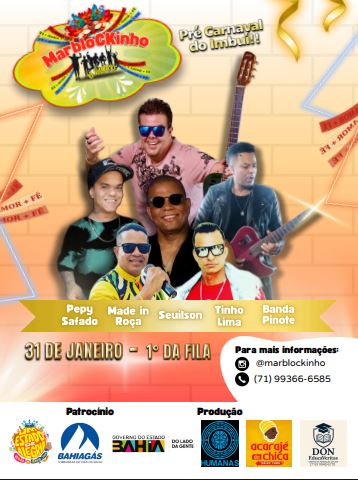 O Bloco Marblockinho composto por moradores da Boca do Rio e Imbuí, desfilará no Pré-Carnaval do Imbuí no dia 31-01-26, sábado, às 17h. Serão 600 associados participando da festa. É uma manifestação cultural importante porque valoriza também os cantores locais e que no tem espaço nos blocos maiores de Salvador. O Instituto Humanas é o produtor desse belo evento!